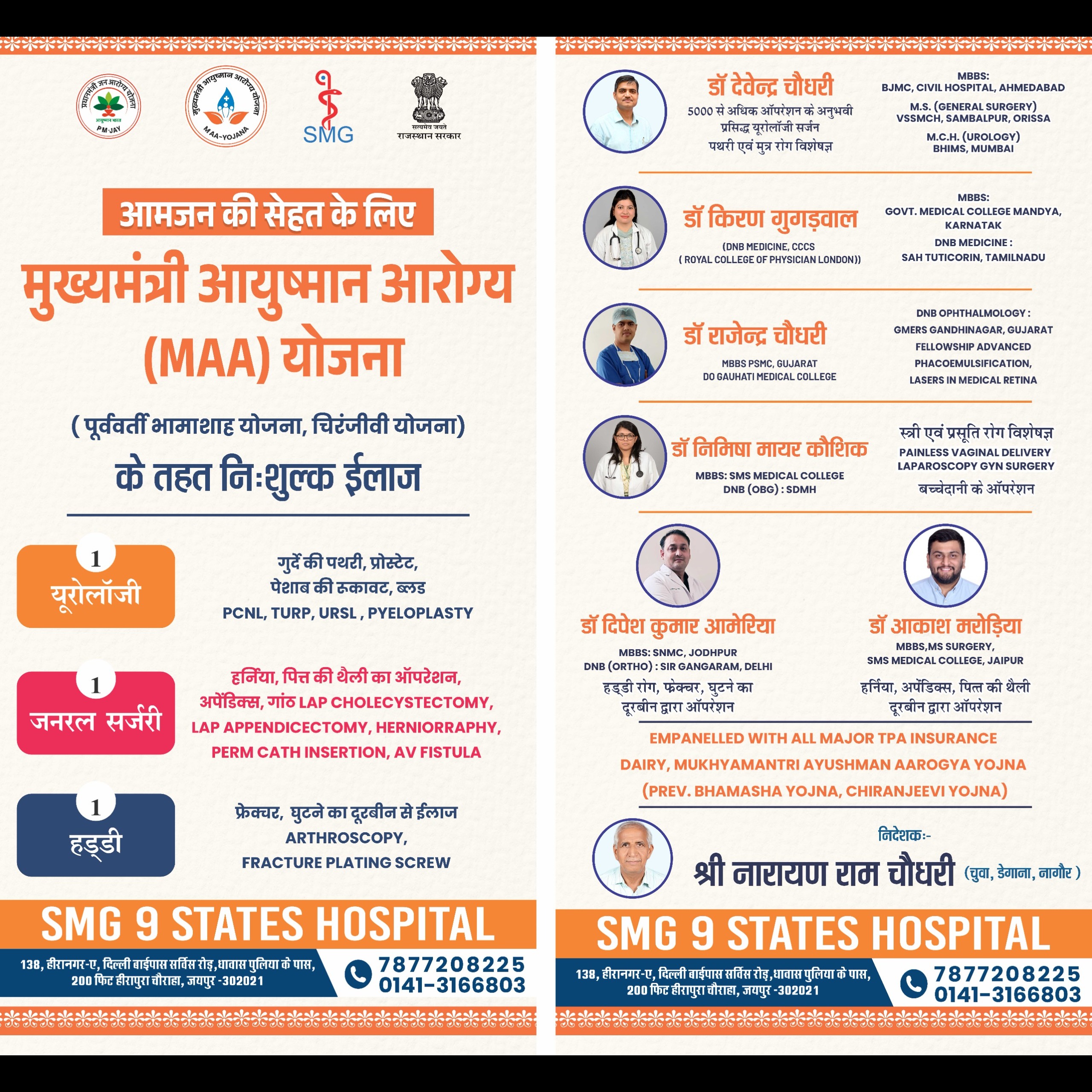 EMPANNELLED WITH MUKHYAMANTRI AYUSHMAN AROGYA YOJNA IN DEPARTMENT OF UROLOGY ( KIDNEY STONE, PROSTATE, BLADDER TUMOR RELATED SURGERY), GENERAL SURGERY (APPENDIX, GALL BLADDER, HERNIA RELATED SURGERY) CASHLESS TREATMENT IN MAA YOJNA. ADDRESS: SMG 9 STATES HOSPITAL, 138 heeranagar A, 200 feet Delhi bypass service Road, near Ajmer road, Jaipur.302021 Location: https://maps.app.goo.gl/SkYpx7mjX3MUzDi56 FOR APPOINTMENT CALL ON THE RECEPTION CONTACT 7877208225