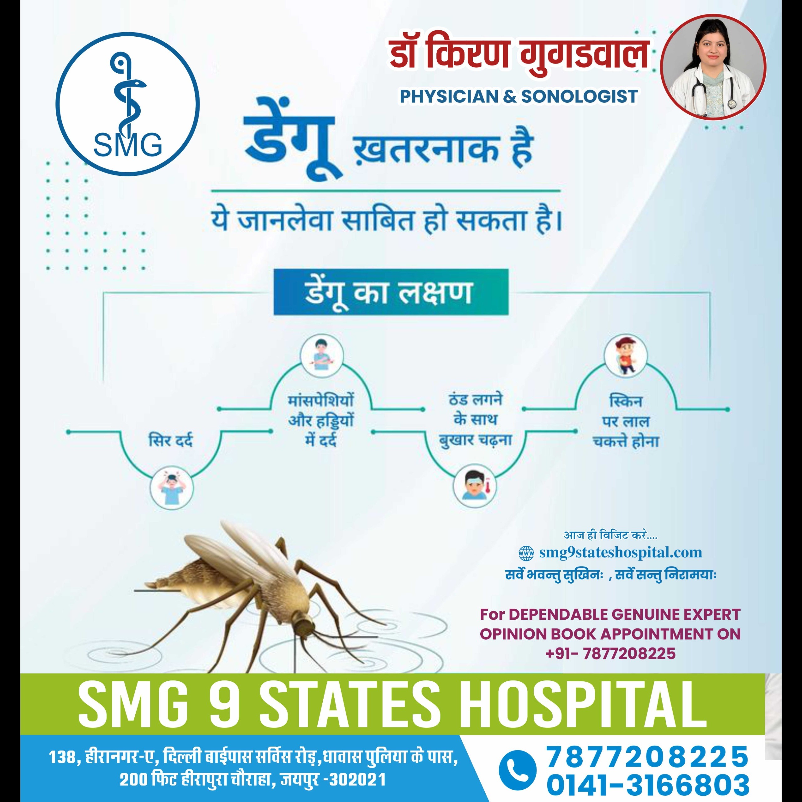 STAY HEALTHY AND HAPPY THIS FESTIVE SEASON. ITS TIME OF FEVER DUE TO VIRAL INFECTION WHICH CAN BE MANAGED BY HOME REMEDIES OF TAKING REST, GOOD HYDRATION, STEAM INHALATION ETC. BUT FOR HIGH GRADE LONG DURATION PERSISTENT FEVER - NEED TO SEE PHYSICIAN. ANY FEVER CAN BE DENGUE , SCRUB TYPHUS LIKE SERIOUS DISEASES ALSO. SO RULE OUT THESE BY SIMPLE LABORATORY BLOOD TEST AVAILABLE AT SMG 9 STATES HOSPITAL. EVERYONE SUFFERING FROM DENGUE FEVER DOES NOT REQUIRE HOSPITAL ADMISSION. BUT NEED TO BE UNDER MEDICAL SUPERVISION OF PHYSICIAN. FOR RELIABLE DEPENDABLE TREATMENT: MEET OUR KNOWLEDGEABLE PHYSICIAN DR KIRAN PALSANIA. AVAILABLE DAILY IN OPD FROM 10AM TO 1 PM (EXCEPT SUNDAY) SMG 9 STATES HOSPITAL ADDRESS: SMG 9 STATES HOSPITAL, 138 heeranagar A, 200 feet Delhi bypass service Road, near Ajmer road, Jaipur.302021 Location: https://maps.app.goo.gl/SkYpx7mjX3MUzDi56 FOR APPOINTMENT CALL ON THE RECEPTION CONTACT 7877208225